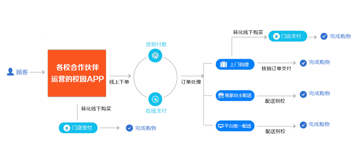 对于交易量大,消耗快递成本过高的商品,通过物流的方式到本地,再由校园的运营者直接配送到用户手上。