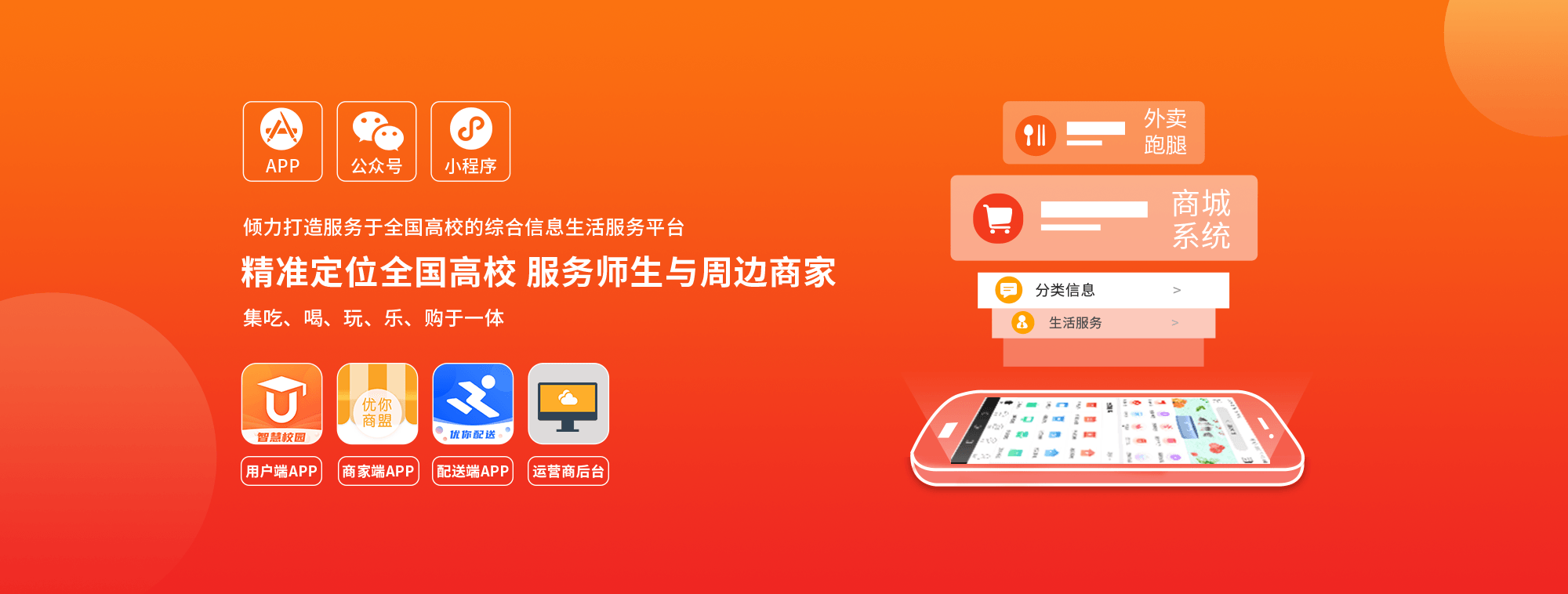 全国成功合作1000多所高校,打造无数成功案例;不断迭代更新,实战打磨产品。输出整套成功的运营推广经验+成熟产品,我们交付给您的不仅仅是软件,更是一个本地商城的完整解决方案。那些创业路上我们踩过的坑,您不必再重蹈覆辙。