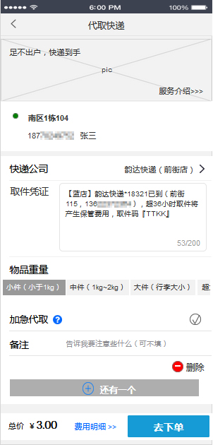 (2)在点击去下单之前,加急代取选项是否隐藏取决于刚进入此页面时加急代取服务是否开启,若开启,则此页面中无论添加了几个快递信息,都显示加急代取选项,此情况下点击去下单时再次判断此刻加急服务是否关闭,若关闭则弹框提示“抱歉,当前暂停了加急代取服务,已为您自动取消加急服务,按钮:好的”,点击好的,隐藏本页面所有快递信息中的加急选项;若刚进入页面时加急服务是关闭状态,则都不显示,下单时无需对此情况做特殊处理。
