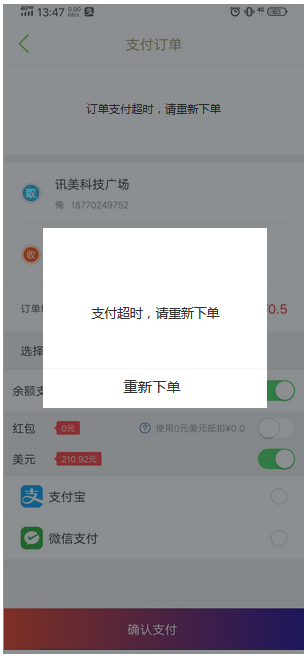7、支付超时:超过15分钟未支付时弹出,点击“重新下单”,跳转到下单页面,同时自动填充用户填写的本订单的各项数据。