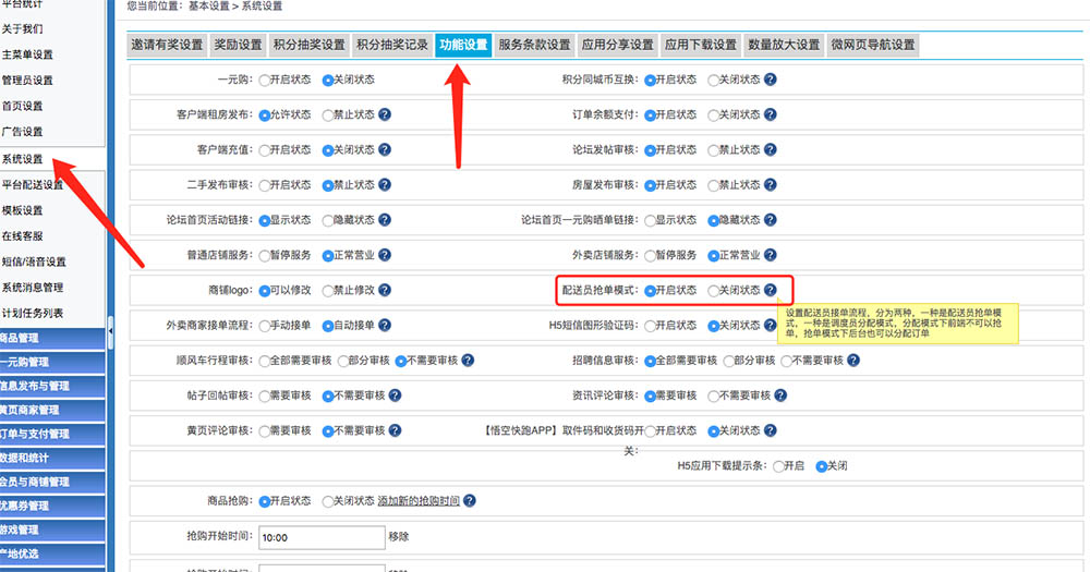 后台-基本设置-系统设置-功能设置-配送员抢单模式