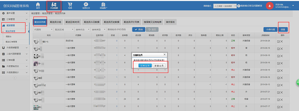 后台外卖跑腿-配送管理-配送员管理-配送员列表(需要配送员本人去同城APP里面注册成为会员,然后再到后台创建配送员)。