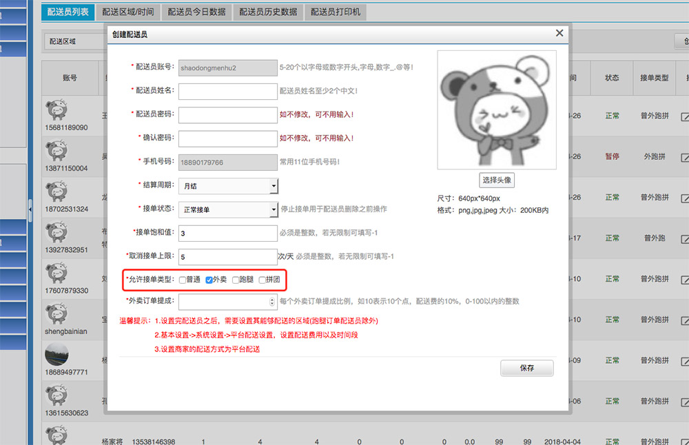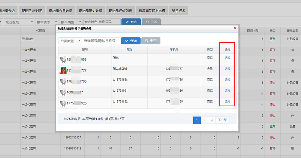 点击创建,然后选择已有会员,在弹框上方搜索框里填入配送员的手机号或账号进行查询,然后在用户列表那里点击选择,在弹框里面填写必填项,填完后,点击右下角保存按钮就可以了。