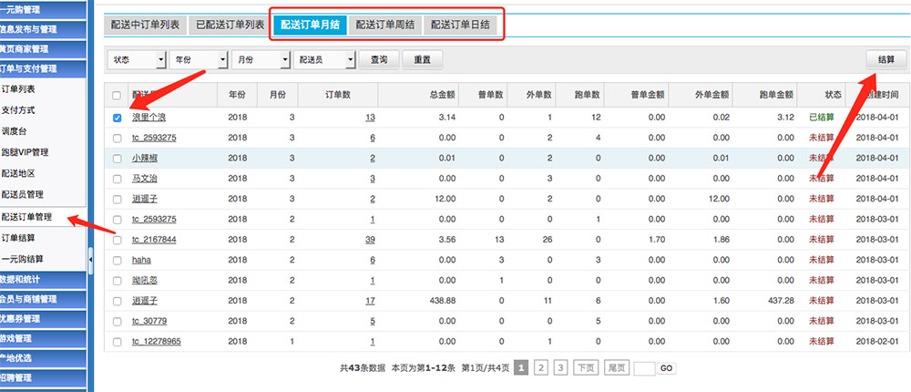 后台-订单与支付管理-配送订单管理-配送订单月结|配送订单周结|配送订单日结。在上方选择对应的结算周期后,在配送员列表那里勾选配送员。点击右上角结算,即可改变配送员的结算状态为已结算。