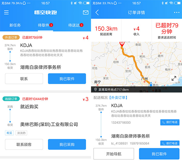 配送员点击“抢单” 按钮,在弹框那里点击“确认抢单”后,该订单会转到上方待取件那里,配送员可以点击上方“待取件”,然后在出现的订单列表那里点击对应的订单进行查看详情,然后前往取件。