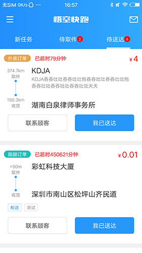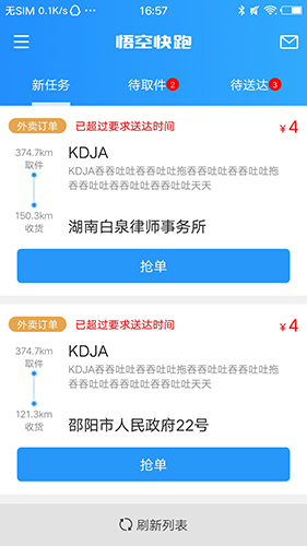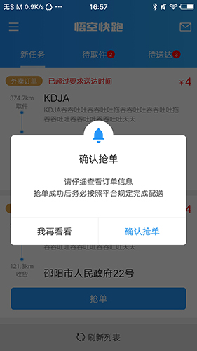 配送员登录悟空快跑,在新任务列表那里可以进行抢单。