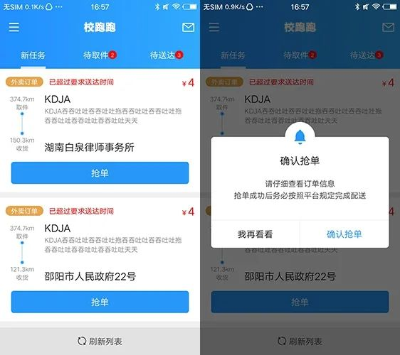配送员登录校跑跑APP,在新任务列表那里可以进行抢单。需要后台开启抢单模式才能进行抢单,否则需要后台进行指派订单。