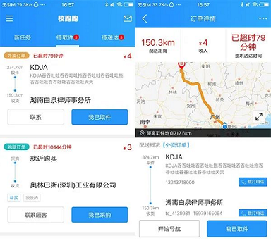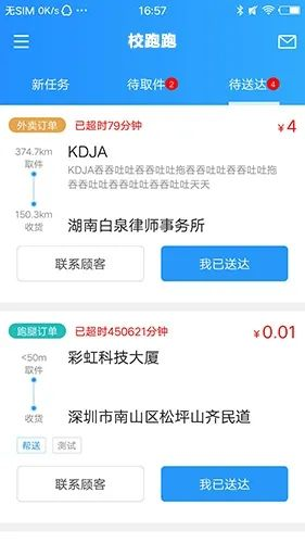 校园跑腿系统的配送端为骑手独立接单专用APP-校跑跑。主页面分为新任务、待取件、代送达三个进度界面。根据用户下达不同类型的订单都会有明显的标签区分外卖订单、普通订单、跑腿订单(帮买、帮送)、调度台指派单、调度台改派单、预约订单。后台可自由设置配送员的处理订单上限和取消订单数上限,防止配送员盲目抢单导致配送不及时。